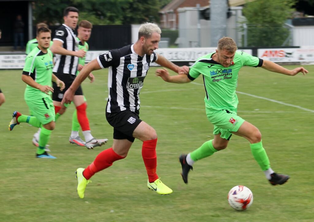 With play repeatedly switching end to end in the second period of the first half, Liam Flanagan turned sharply to strike the ball past the top angle of the Brigg goal, immediately provoking a response from a Scott Phillips’ header after a free-kick into the goal area had been awarded for a foul on Jack Richardson. Harry Clapham was played clear of the home defenders again but Miles Fenty timed his dive to save well.